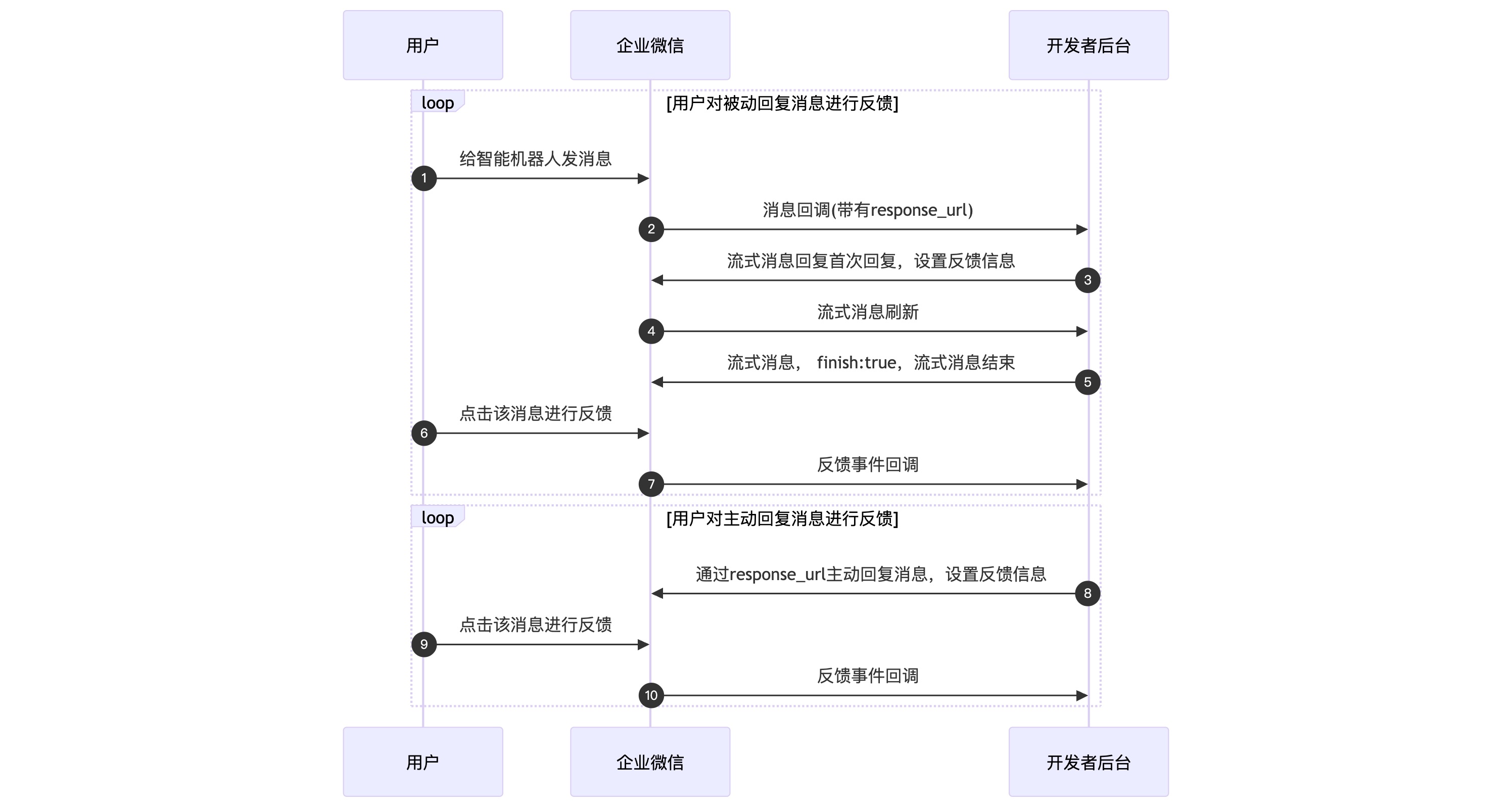 开发者接收到智能机器人的消息事件后,可以将事件与即将回复的流式消息关联起来,并在被动回复/主动回复消息中设置反馈信息。当用户进行反馈时,可以收到用户反馈事件,复盘智能机器人的回复效果