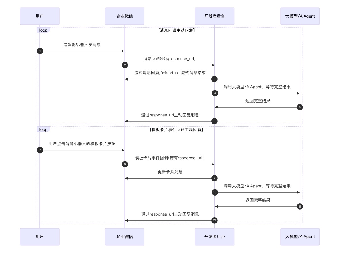 当用户与智能机器人进行交互时,企业微信会将相关的交互事件回调到开发者设置的回调URL,回调中会返回一个 response_url 。开发者可根据事件类型先做出相应的响应,待处理完业务逻辑后,使用response_url主动调用接口回复消息,实现丰富的自定义功能。