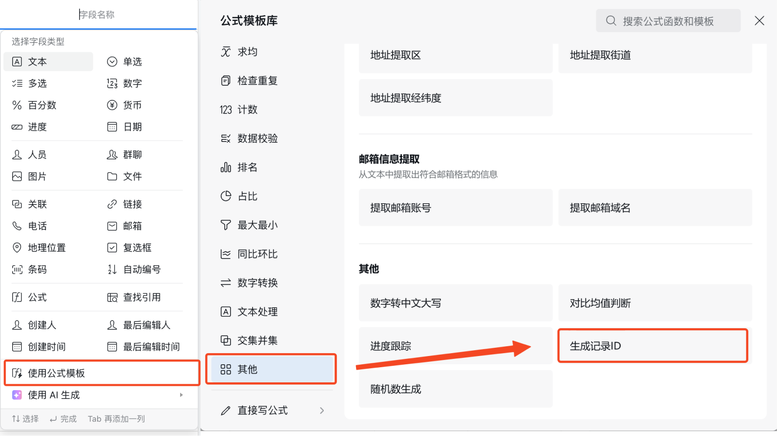 3. 通过智能表格公式字段模板(如下图)获取记录ID