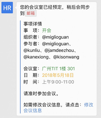 "content": "您的会议室已经预定,稍后会同步到`邮箱` \n>**事项详情** \n>事 项:<font color=\"info\">开会</font> \n>组织者:@miglioguan \n>参与者:@miglioguan、@kunliu、@jamdeezhou、@kanexiong、@kisonwang \n> \n>会议室:<font color=\"info\">广州TIT 1楼 301</font> \n>日 期:<font color=\"warning\">2018年5月18日</font> \n>时 间:<font color=\"comment\">上午9:00-11:00</font> \n> \n>请准时参加会议。 \n> \n>如需修改会议信息,请点击:[修改会议信息](https://work.weixin.qq.com)"