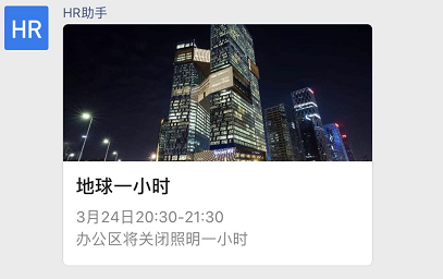 "content": "3月24日20:30-21:30 \n办公区将关闭照明一小时,请各部门同事相互转告",