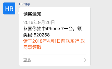 "description" : "<div class=\"gray\">2016年9月26日</div> <div class=\"normal\"> 恭喜你抽中iPhone 7一台,领奖码:520258</div><div class=\"highlight\">请于2016年10月10日前联系行 政同事领取</div>",