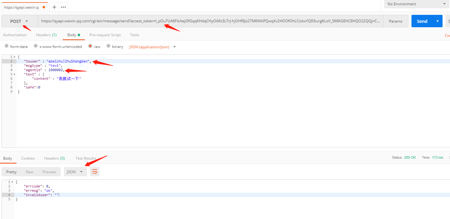 如下图示,以上面两步得到的access_token和消息体为参数,在postman中发送post请求即可(红色箭头所指为需要注意的点)