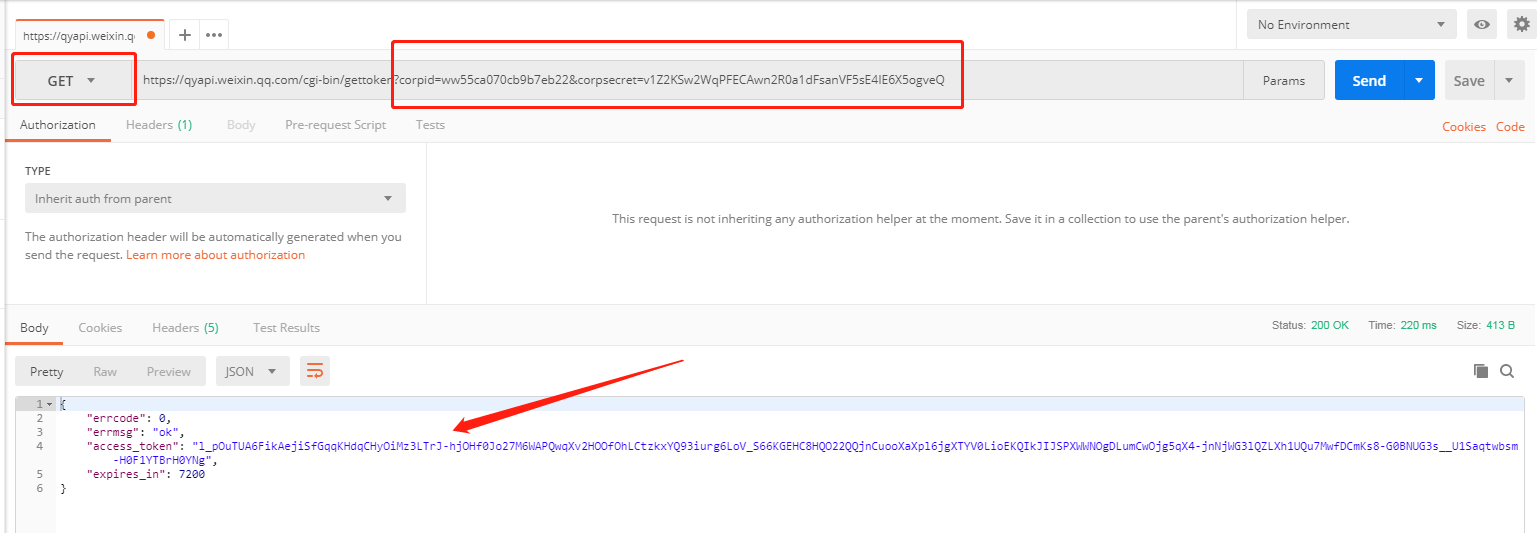 使用postman发送这样一个GET请求即可得到access_token(请把截图中的corpid、corpsecret换为自己的corpid、应用secret)