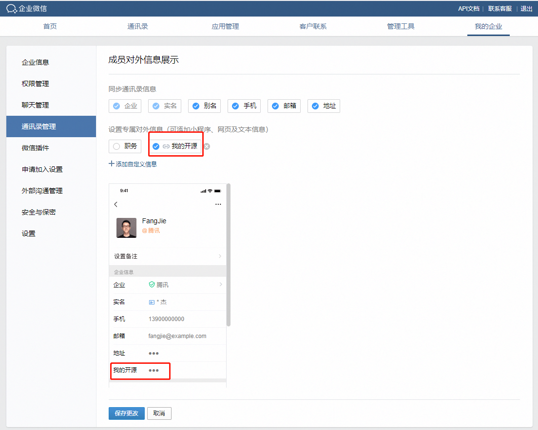 成员自定义对外信息的入口进入的,调用getContext返回的是normal(为什么呢?因为这里不涉及客户管理功能,并不能调用客户联系的相关接口),设置入口如下图:
