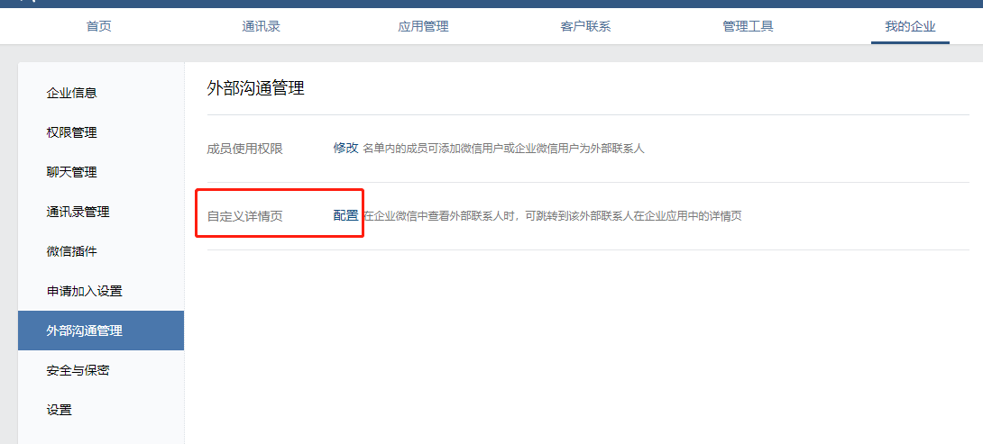 注意配置入口是在企业管理端--外部沟通管理--自定义详情页)