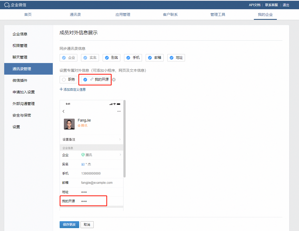 1. 联系人详情的入口(注意配置入口是在企业管理端--外部沟通管理--自定义详情页)