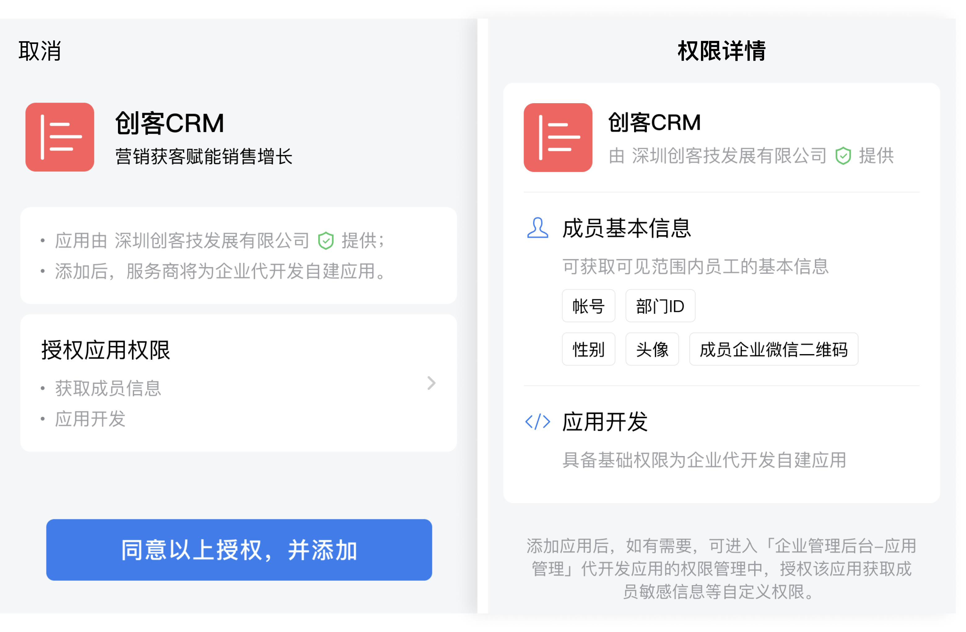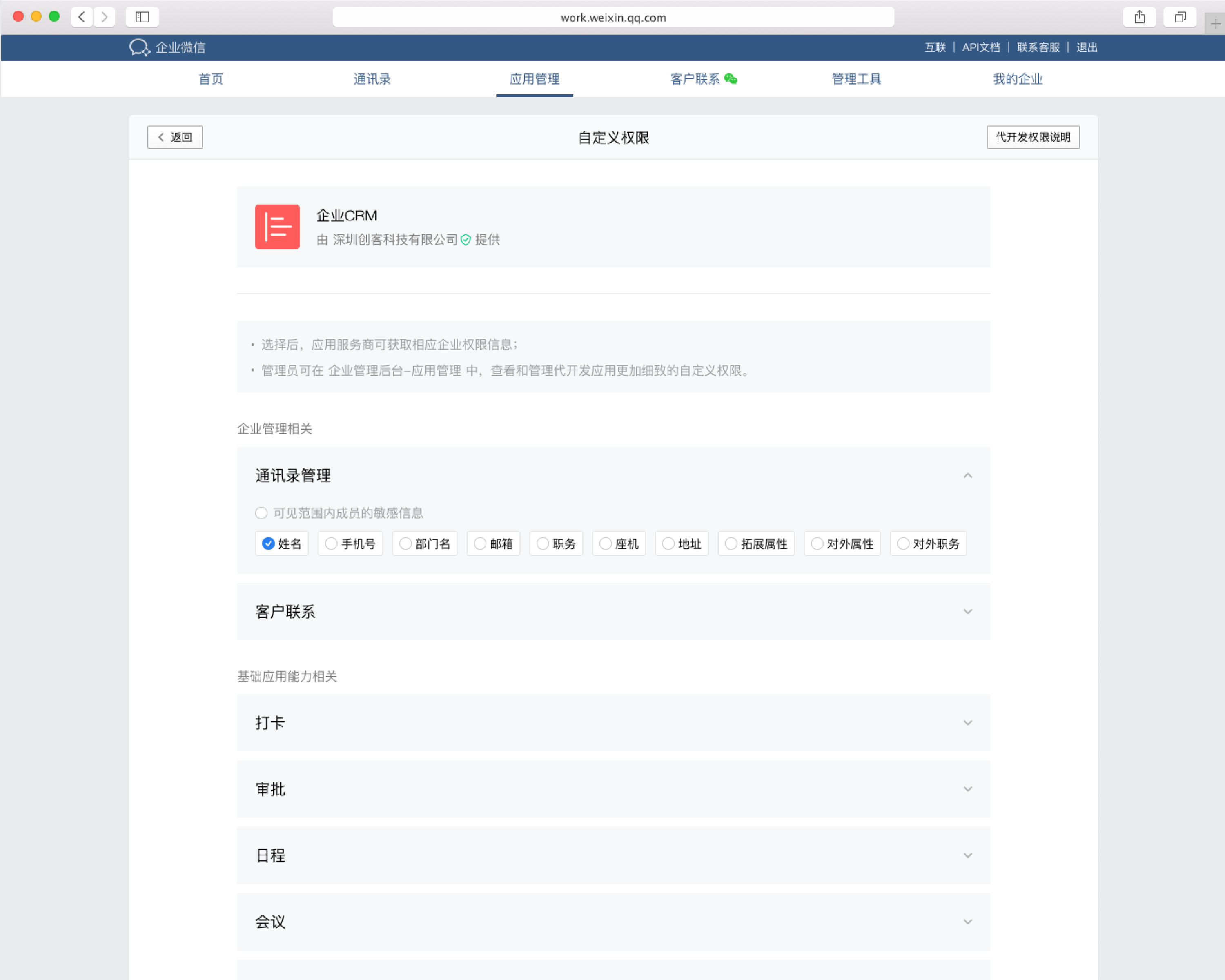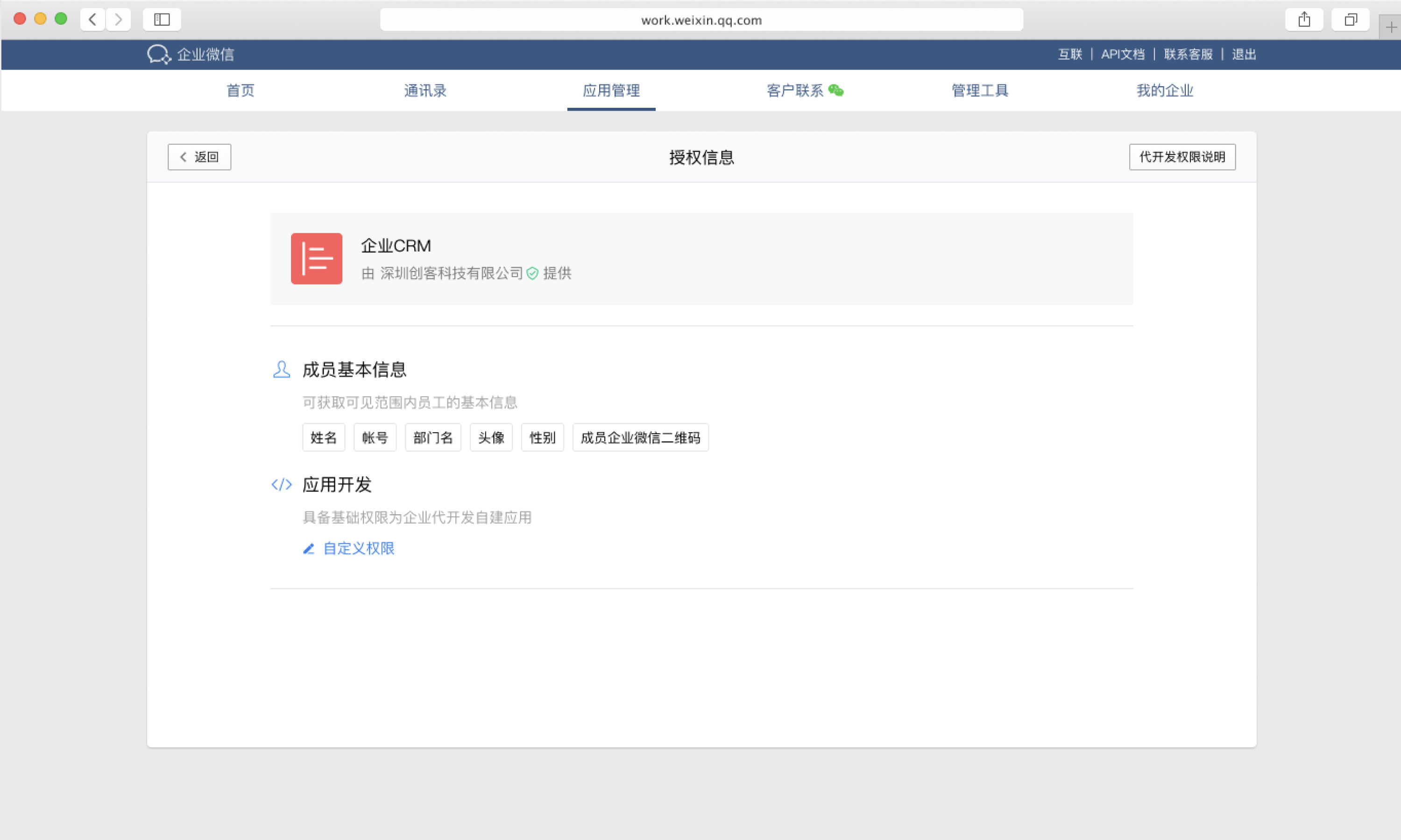 自定义权限,则需要企业额外进行确认后,代开发应用才可以获取具体自定义权限。