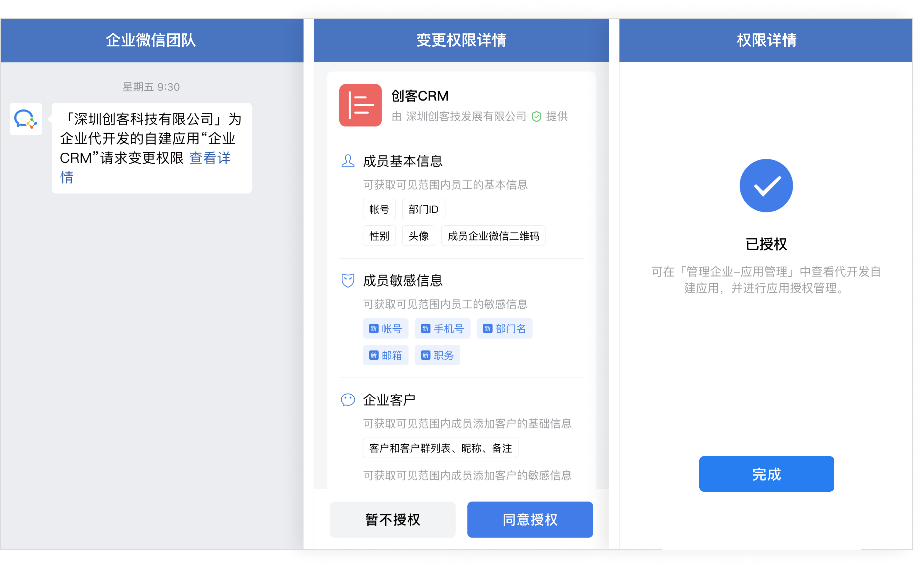 申请后,系统将向企业推送代开发应用权限变更消息,企业进入后可进行服务商所需的自定义权限进行确认。